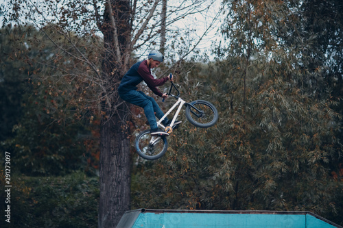 Professional young sportsman cyclist with bmx bike doing trick at skatepark