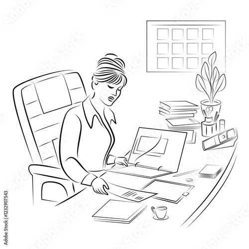 Profile of a cute lady. Young girl at work in the office sitting at the table and working secretary. woman is very busy. Vector illustrations.