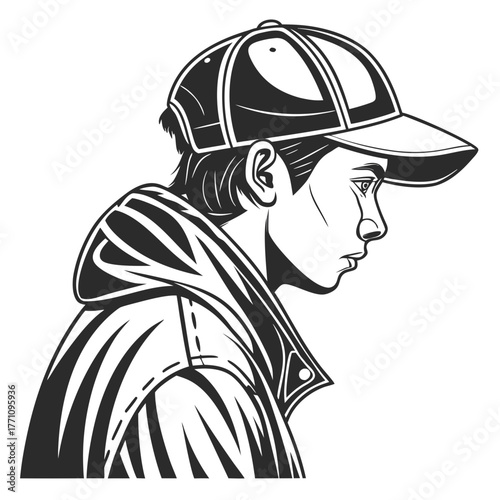 Profile of a Young Person Wearing a Baseball Cap and Hoodie Keywords: person, young, male