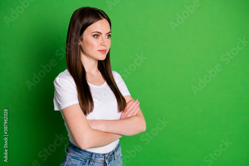 Profile photo of confident adorable accountant dressed casual outfit arms folded look empty space isolated green color background