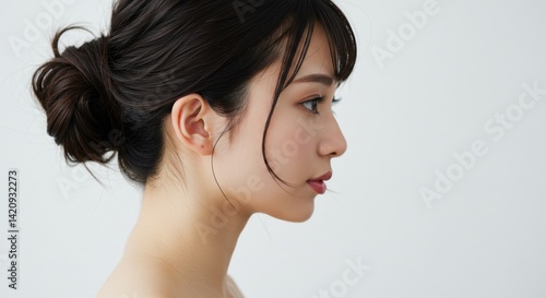 Profile portrait of a young Japanese woman with hair up on white background