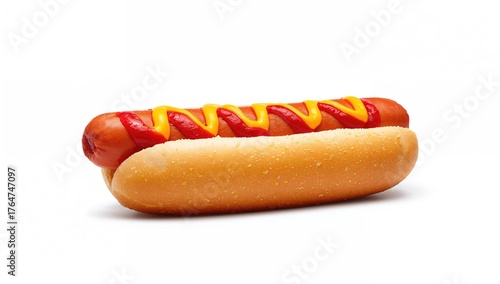 Profile view of a sandwich topped with ketchup and mustard against a white backdrop