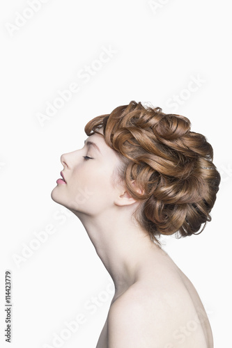 Profile view of beautiful woman with closed eyes against white background