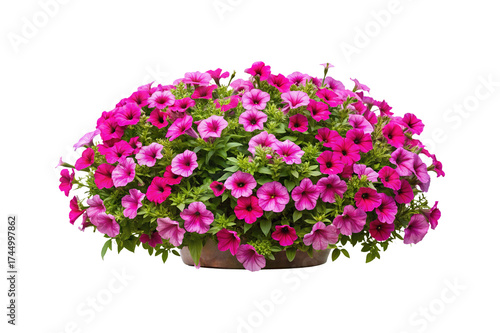 Profusion of Pink Petunias in a Terracotta Pot Against White Background