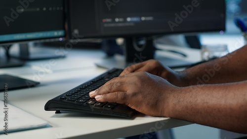 Programmer in server farm workspace protecting data threatened by hacking attacks on computers. IT professional writing code, safeguarding data center from unauthorized access, camera A close up