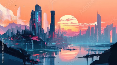 Progress in flat design side view futuristic city theme water color split-complementary color scheme.