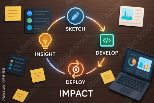 Project workflow concept with sketch, develop, deploy, and insight stages shown on wooden desk with laptop and sticky notes