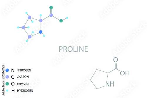 Proline molecular skeletal 3D chemical formula.