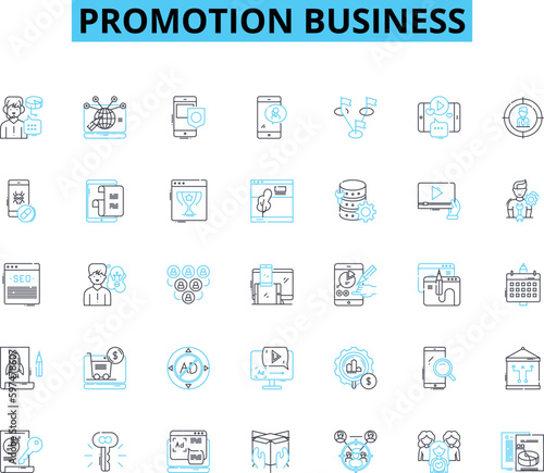 Promotion business linear icons set. Advertising, Marketing, Branding, Publicity, Promotions, Sales, Campaigns line vector and concept signs. Exposure,Engagement,Outreach outline illustrations