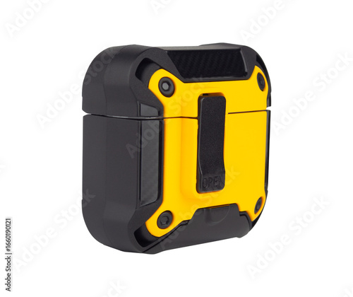protective case with carabiner for wireless headphones, isolated from the background