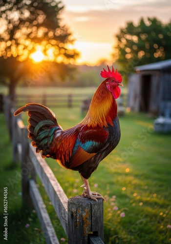 Proud Rooster Perched on a Wooden Post at Dawn on Picturesque Farm