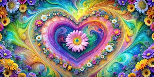 Psychedelic heart with a swirl of pastel colors and flowers surrounding it in a circle