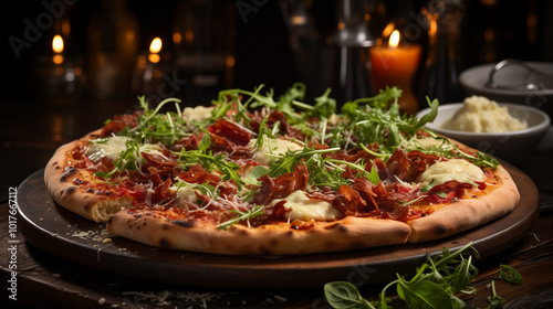 Puff dough edged neapolitan pizza with prosciutto, arugula, dried tomatoes. Soft moon shine