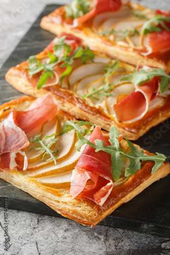 Puff pastry sandwich with pear, ham and arugula close-up on marble board on table. Vertical