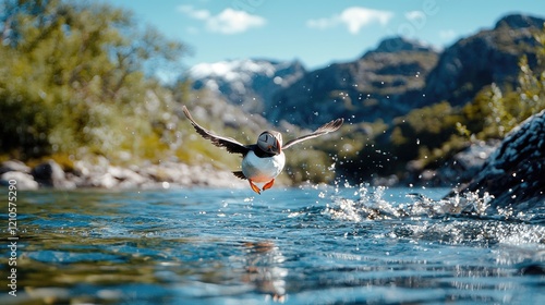 Puffin taking flight over mountain river