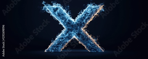 Pulsating blue flame x mark icon digital space graphic design dark background close-up floating concept
