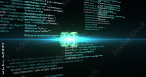 Pulsating glowing green orb emitting light streaks in digital cyberspace, with scrolling code