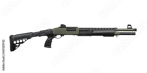 Pump-action 12 gauge shotgun isolated on a white back. A smooth-bore weapon with a plastic stock.