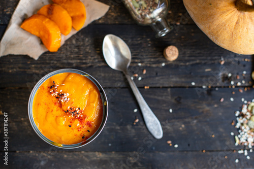 pumpkin cream soup eat first course top view copy space for text food background rustic keto or paleo diet
