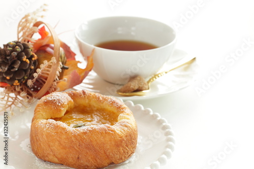 Pumpkin Danish pastry on white background with copy space