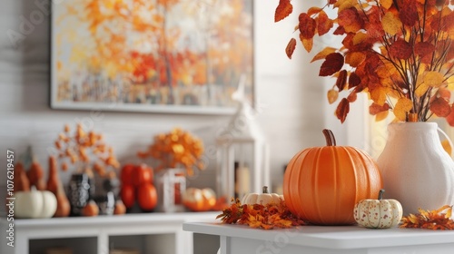 Pumpkin displayed on a white table surrounded by fall foliage, creating a warm autumn atmosphere. This vibrant pumpkin and fall foliage arrangement adds seasonal charm and color.