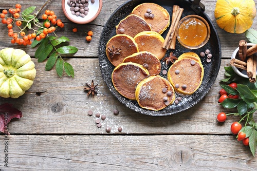 Pumpkin pancakes with chocolate chips fresh blueberry. Overhead view
