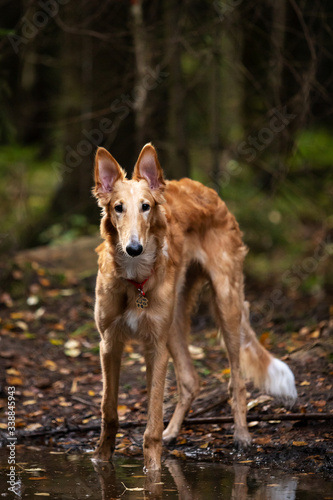 Puppy borzoi walks outdoor at summer day