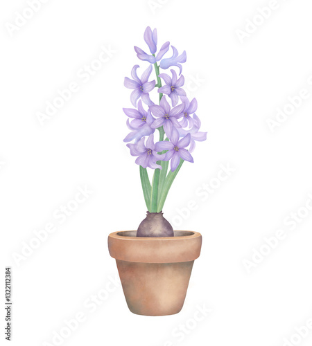 Purple hyacinth with green leaves in flowerpot. Watercolor botanical illustration isolated on white. Hand drawn spring flower for invitations, greetings, wedding, postcard design