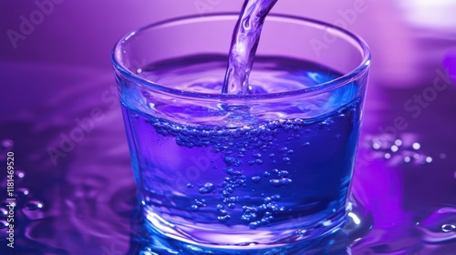 Purple liquid pouring into a glass, creating bubbles and ripples.