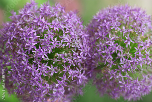 Purple Onion flower on green blurred background. Macro photo of alium flowers. Allium flowering Onion with violet lilac flower ball. Close-up of a Allium Giganteum flower. Horizontal photo