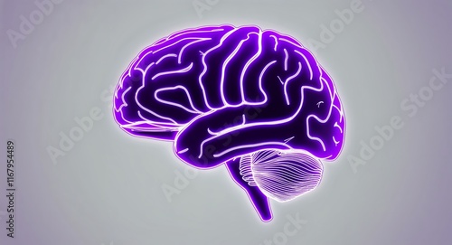 Purple theme brain neon hologram on plain white background