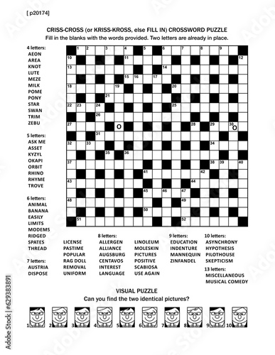 Puzzle page with two games: 19x19 fill-in (or criss-cross, else kriss-kross) crossword puzzle and visual puzzle with whimsical faces. Black and white, A4 or letter sized.
