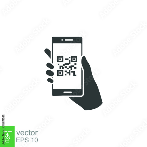 QR code scanning in smartphone screen. Hand holding Mobile phone. Simple solid icon style, barcode scanner for pay, web, mobile app. Vector illustration isolated. EPS 10.