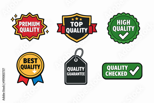 Quality assurance badges collection featuring premium, top, best, high, and guaranteed signs