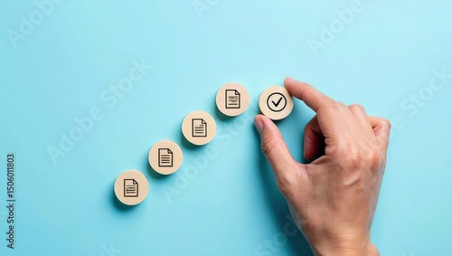 Quality control and certification process concept. A hand places wooden block with checkmark icon in step-by-step symbolizing process of document review, checklist, approval, and quality certificate.