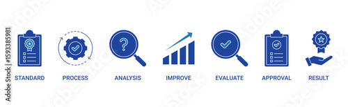 Quality Control icon set with standard, process, analysis, improve, evaluate, approval and result icon concept illustration.