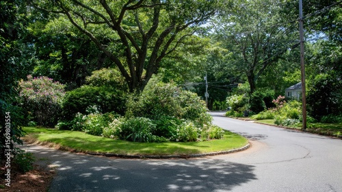 Quiet asphalt intersection shaded by thick foliage and bordered by healthy, expansive lawns