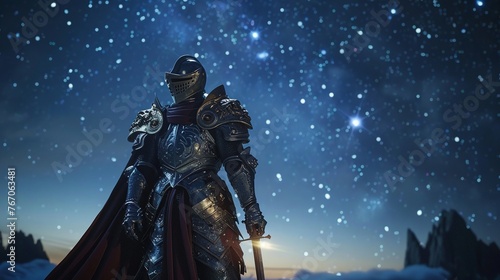 Quixotic knight under starry sky, wide angle, dreamlike illumination,