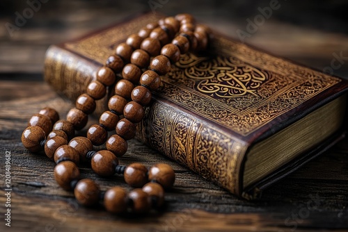 Quran and prayer beads rest on aged wooden surface