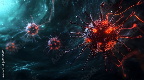 Rabies Virus in Nervous System, the rabies virus traveling along nerve fibers, in a dark background to symbolize the nervous system
