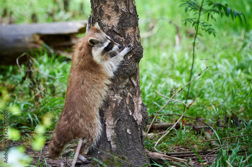 Raccoon climbing in tree (Procyon lotor)