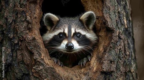 Raccoon peeking from tree hollow, forest background; wildlife, nature photography