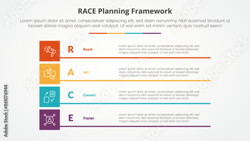 RACE framework infographic concept for slide presentation with boxed creative rectangle stack with 4 point list with flat style