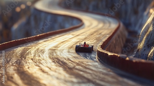 Racer navigating winding oval track at sunset during thrilling racing event