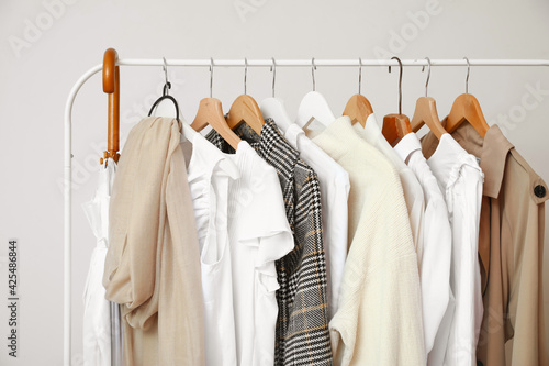Rack with modern clothes in room
