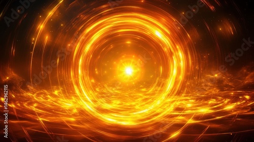 Radiant glowing golden circular vortex emitting light with sparkling particles and swirling energy patterns in a dark background