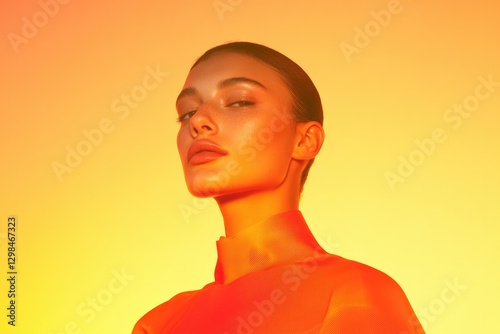 Radiant portrait showcasing model in vibrant orange tones agains