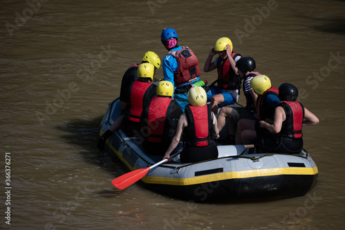 Rafting boat stopped in a murky water to regain the team members strenght for a crazy adventure down the river