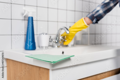 Rag on sink near detergent and woman near faucet on blurred background in bathroom