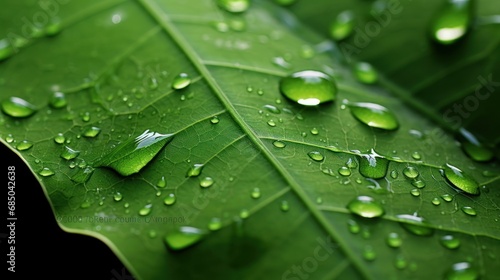 Rain drops on beautiful leaves, water drops on a fresh green background.